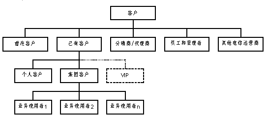 同時(shí),客戶(hù)服務(wù)中心的服務(wù)對(duì)象進(jìn)一步擴(kuò)大,按照是否已經(jīng)使用該電信運(yùn)營(yíng)商提供的電信業(yè)務(wù)將客戶(hù)劃分為:潛在客戶(hù)、已有客戶(hù)。這里的潛在客戶(hù)并不針對(duì)某一具體的電信業(yè)務(wù),而是針對(duì)電信運(yùn)營(yíng)商整體而言。其中,已有客戶(hù)又分為個(gè)人客戶(hù)和集團(tuán)客戶(hù)。集團(tuán)客戶(hù)內(nèi)部存在多個(gè)業(yè)務(wù)使用者,這些業(yè)務(wù)使用者本身也是客服系統(tǒng)的客戶(hù)。分銷(xiāo)/代理商代為發(fā)展電信運(yùn)營(yíng)商的客戶(hù),同時(shí)他們也可以單獨(dú)作為一種特殊客戶(hù)享有客服系統(tǒng)提供的服務(wù)。在個(gè)人客戶(hù)和集團(tuán)客戶(hù)中,均會(huì)有一部分成為特殊的VIP。此外,對(duì)客服系統(tǒng)來(lái)說(shuō),電信運(yùn)營(yíng)商的員工和管理者也是"客戶(hù)";同時(shí),從網(wǎng)間互聯(lián)和網(wǎng)間結(jié)算的角度,其它運(yùn)營(yíng)商也應(yīng)該按照客戶(hù)來(lái)對(duì)待。