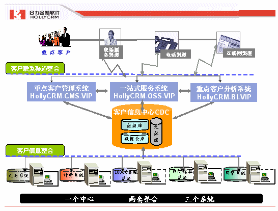 HOLLYCRM(合力金橋軟件)基于電信行業(yè)IT發(fā)展和山東省通信公司重點(diǎn)客戶管理系統(tǒng)建設(shè)目標(biāo)和原則的要求,根據(jù)多年來(lái)對(duì)電信CRM領(lǐng)域的研究以及在實(shí)際項(xiàng)目建設(shè)實(shí)施過(guò)程中的經(jīng)驗(yàn)獲得,科學(xué)地提出了針本項(xiàng)目的"一個(gè)中心,二套整合,三個(gè)系統(tǒng)"的建設(shè)理念。如下圖: