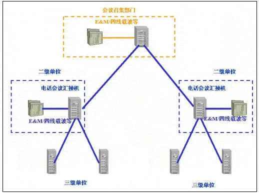 當前國內(nèi)許多行業(yè)由于行業(yè)的業(yè)務(wù)特點,在原有的電話網(wǎng)應(yīng)用中,電話會議作為常用的交流手段發(fā)揮著重要作用。這些行業(yè)的電話會議業(yè)務(wù),主要是通過電話會議匯接機的方式實現(xiàn):會議召集單位通過電話會議匯接機(以下簡稱匯接機)通過專線、撥號等方式連通下級單位(以下簡稱二級單位)的匯接機,二級單位的匯接機通過專線、撥號等方式連通所轄單位(以下簡稱三級單位)的會場電話。這樣通過多級匯接機級連的方式實現(xiàn),主持單位和二、三級單位間的電話網(wǎng)連通,利用匯接機實現(xiàn)廣播、三方通話、調(diào)度發(fā)言單位等會議功能。