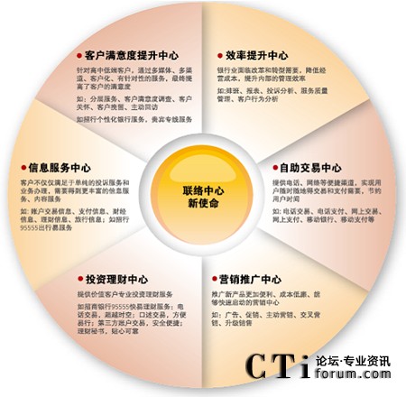 對(duì)于銀行業(yè)來(lái)說,聯(lián)絡(luò)中心已經(jīng)成為為客戶提供優(yōu)質(zhì)、快捷的金融理財(cái)服務(wù)的第二窗口。隨著電子化建設(shè)的不斷深入,寬帶、Internet和3G時(shí)代帶來(lái)的IP融合,聯(lián)絡(luò)中心為金融服務(wù)帶來(lái)了更廣泛的創(chuàng)新,未來(lái)的銀行聯(lián)絡(luò)中心將為客戶提供的金融服務(wù)趨于無(wú)所不能。銀行聯(lián)絡(luò)中心已經(jīng)成為自助交易中心、投資理財(cái)中心、營(yíng)銷推廣中心和信息服務(wù)中心,借助聯(lián)絡(luò)中心,銀行與客戶可以隨時(shí)隨地建立緊密的多媒體互動(dòng),提升客戶滿意度和服務(wù)效率。