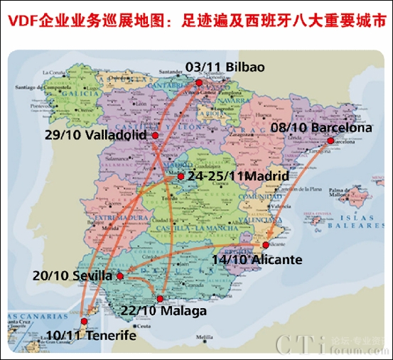 Vodafone 09企業(yè)業(yè)務(wù)巡展是Vodafone攜手10家重要合作伙伴和28家SP針對西班牙企業(yè)用戶舉行的一個(gè)大型巡展,整個(gè)展會歷時(shí)兩個(gè)月,以西班牙的經(jīng)濟(jì)文化中心Barcelona為起點(diǎn),途徑Alicante、Sevilla、Malaga、Valladolid、Bilbao、Tenerife,最后于11月24-25號在西班牙首府Madrid隆重謝幕。共有1萬多人、五千多家企業(yè)參加了本次展會,受邀企業(yè)覆蓋到金融、貿(mào)易、電信、交通、建筑、服務(wù)、醫(yī)療保健等重要行業(yè),其中大都為移動辦公需求旺盛需要保持實(shí)時(shí)協(xié)同的中小型企業(yè)。展會期間,華為歐洲地區(qū)部多位高層領(lǐng)導(dǎo)親臨展會現(xiàn)場指導(dǎo)工作,包括Vodafone系統(tǒng)部副總Edward Chan和張文林、代表處代表謝新平、歐洲軟件業(yè)務(wù)部領(lǐng)導(dǎo)林劼。領(lǐng)導(dǎo)們和客戶親切交流,并廣泛了解了其他SP展出的多項(xiàng)創(chuàng)新業(yè)務(wù)。