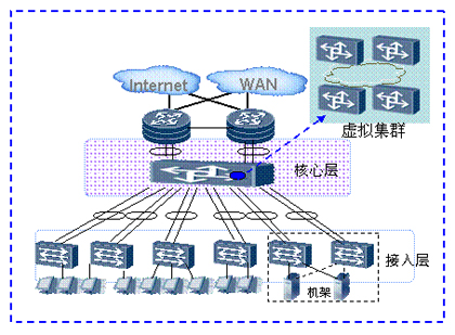 如上圖所示,整個數(shù)據(jù)中心網(wǎng)絡(luò)通過虛擬集群技術(shù),多個核心層設(shè)備虛擬為一臺設(shè)備。通過增加核心節(jié)點,提供無阻塞的網(wǎng)絡(luò)能力,接入更多服務(wù)器。服務(wù)器的規(guī)?梢詮3000臺“無級擴(kuò)展”到數(shù)萬臺。在滿足企業(yè)日益增長的業(yè)務(wù)需求的同時,并不增加網(wǎng)絡(luò)的復(fù)雜度,減少管理和維護(hù)的成本。