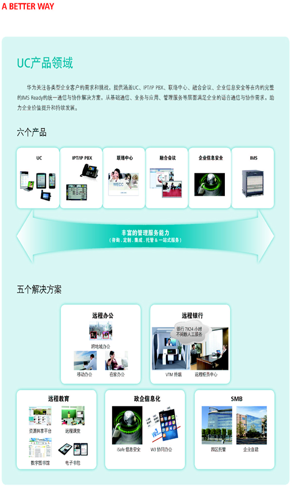 華為企業(yè)業(yè)務(wù)是華為三大業(yè)務(wù)集團(tuán)之一。依托華為強(qiáng)大的研發(fā)和綜合技術(shù)能力,我們在企業(yè)業(yè)務(wù)領(lǐng)域與合作伙伴開放合作,理解客戶所需,致力于為全球政府及公共事業(yè)、金融、交通、電力、能源、商業(yè)企業(yè)及互聯(lián)網(wǎng)等行業(yè)以及大中小企業(yè)客戶提供全面、高效的ICT解決方案和服務(wù),包括IP基礎(chǔ)網(wǎng)絡(luò)、統(tǒng)一通信與協(xié)作、云計(jì)算與數(shù)據(jù)中心等。