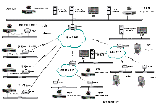 為進(jìn)一步強(qiáng)化企業(yè)內(nèi)部的集約化管理,中國工商銀行決定部署IP視頻會(huì)議網(wǎng)。要求該系統(tǒng)基于寬帶通信網(wǎng)絡(luò),建立起工行總行與下屬各單位間的視頻聯(lián)系,提供語音、圖像和演示的交互,從而實(shí)現(xiàn)二級(jí)分行以上的視頻會(huì)議系統(tǒng)。同時(shí),總行通過視頻會(huì)議可以加強(qiáng)對(duì)下屬單位的有效控制和業(yè)務(wù)管理、實(shí)現(xiàn)高效辦公、減少會(huì)議開支,而且通過多媒體交互技術(shù),實(shí)現(xiàn)直觀、可靠、便捷的會(huì)議效果,為今后逐步實(shí)現(xiàn)工行扁平化管理提供安全、便利和快捷的技術(shù)基礎(chǔ)。另一方面,各分會(huì)場(chǎng)可以通過該系統(tǒng)提高工作效率,進(jìn)行交互式的技術(shù)培訓(xùn)、技術(shù)方案探討等工作。