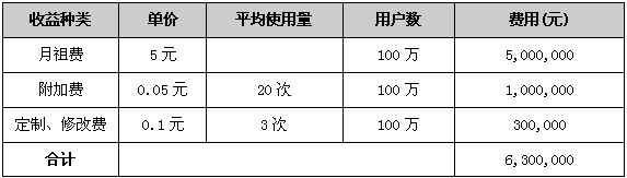根據(jù)以上所述,假如用戶(hù)數(shù)為100萬(wàn),CRBT月租費(fèi)為5元,并提供20次的免費(fèi)呼叫,之上每次呼叫收取0.05元假若每月附加呼叫為平均20次,即每月用戶(hù)平均收到40次呼叫。且每用戶(hù)每月至少定制或修改三條CRBT,每次收費(fèi)0.1元。
