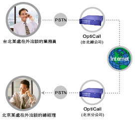 有了AltiGen提供的網(wǎng)路電話閘道器,跨國公司的臺北業(yè)務員只要花市內(nèi)電話的費用,就可以跟北京出差的總經(jīng)理共商要事,節(jié)省的70 %以上的國際電話費用。通訊流程如下: