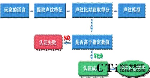 聲紋認證是用戶通過電話至服務(wù)器端,服務(wù)器根據(jù)用戶注冊的聲紋來識別,通過認證則為合法用戶,否則為非法用戶。認證成功后,服務(wù)器端給予用戶一組動態(tài)數(shù)字,再結(jié)合靜態(tài)密碼,這樣可大幅提高用戶在網(wǎng)絡(luò)游戲中的安全性。(如下圖)
