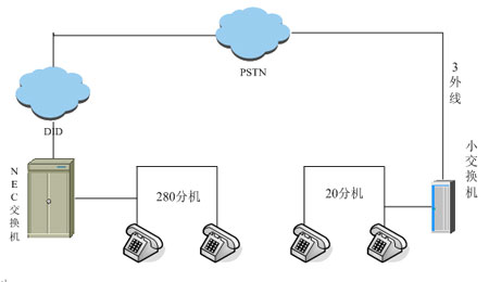據了解,該門業(yè)企業(yè)本次將北京的兩個辦公地點(總部和廠區(qū))率先進行了嘗試。之前兩處均NEC交換機,中繼為電信DID接入(線數:300+)尚有20個號碼可用。企業(yè)希望能加強通訊管理,將廠區(qū)通訊系統(tǒng)與總部通訊系統(tǒng)合二為一,費用和管理均在總部進行。