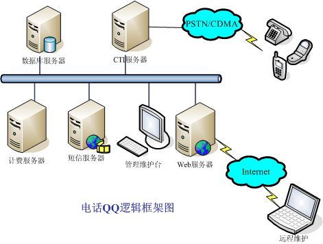 電話QQ系統(tǒng)主要由CTI服務(wù)器、數(shù)據(jù)庫(kù)服務(wù)器、計(jì)費(fèi)服務(wù)器、短信服務(wù)器、管理維護(hù)臺(tái)和Web服務(wù)器組成。