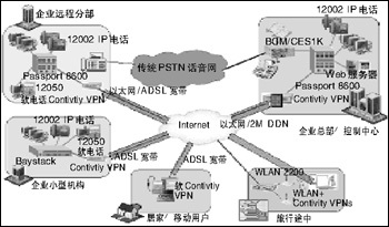 在企業(yè)網(wǎng)上加載北電網(wǎng)絡(luò)話音設(shè)備(BCM,CSE1K或ITG/M1),再配合上北電網(wǎng)絡(luò)的IP電話i2002/i2004,或在移動用戶的PC上安裝i2050