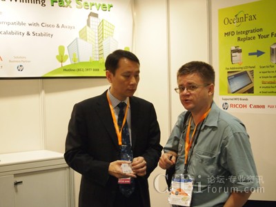 圖:傲訊全通CEO謝昭興先生(左)向來(lái)訪買(mǎi)家介紹OceanFax傳真服務(wù)器的最新功能