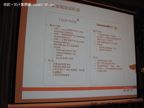 喻思成在介紹甲骨文在云計(jì)算產(chǎn)品的時(shí)候毫不掩飾對(duì)Oracle數(shù)據(jù)庫云服務(wù)器和Oracle中間件云服務(wù)器的贊譽(yù)。他說,甲骨文將這兩款產(chǎn)品稱之為“經(jīng)過預(yù)調(diào)測的系統(tǒng)”。它們均由硬件和軟件組成,硬件和軟件能以一種優(yōu)化的方式協(xié)調(diào)一致地運(yùn)行,并以一種預(yù)集成的工作狀態(tài)提供給客戶,因此具有極高的性能和效率,是數(shù)據(jù)庫的理想目標(biāo)平臺(tái),也是在中間層合并幾十或數(shù)百個(gè)應(yīng)用的理想目標(biāo)平臺(tái)。由于它們都是由甲骨文預(yù)集成和預(yù)配置的,因此也簡化了部署,能減少總的硬件量并降低環(huán)境復(fù)雜性,因此對(duì)客戶而言,其總體擁有成本更低。