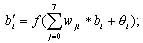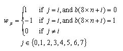 其中,函數(shù)f(x)代表,當(dāng)x≧0時,f(x)等于1;否則f(x)等于0。又其中的wji及θi均為bi的參考值,而其每一個bi的參考值其計算方法如下列式(1.3)及式(1.4)所示。