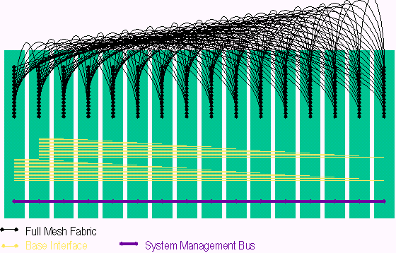 PICMG 3.0包含多種傳輸,這些傳輸模式如圖由下而上依序提供系統管理層、控制層、資料層等的聯接。系統管理是基于一條與各槽位都相連的I2C 雙串行信號線, 系統管理信息則是基于IPMI規(guī)范被擴展到在PICMG3.0規(guī)范中使用。系統管理總線也是冗余方式確保在一條總線故障情況下,管理信息仍正常傳遞。在資料層旁邊的控制層稱作Base 接口 (Base Interface),Base接口是一個雙星型的拓撲結構具有冗余的交換刀片和以太網BAST-T信號,在PICMG 3.0中提供IP傳輸,這點在架構定義上非常像PICMG 2.16。PICMG 3.0單板的高速數據傳輸是通過Fabric接口 (Fabric Interface),Fabric接口是基于3.125Gbps SERDES信號,可以在星型和全網狀結構中支持10Gb的傳輸速率。正如上面提到的,PICMG 3.0核心規(guī)范定義了Fabric接口的信號和互聯,而輔助規(guī)范定義了用于傳輸的協議。PICMG 3.0 背板的互聯支持全網狀Fabric接口,雙星型Base接口和冗余的系統管理,如下圖所示: