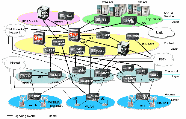 控制層是由以IMS為核心的所有控制部分所組成。IMS獨(dú)立于接入技術(shù),是3G"家族"公用的。IMS基于IP技術(shù),支持語音、視頻、文字、數(shù)據(jù)等業(yè)務(wù)以及這些業(yè)務(wù)的組合,支持IPv6和QoS,支持開放的業(yè)務(wù)接口。該層還包括如MSC服務(wù)器,信令網(wǎng)關(guān)等設(shè)備。