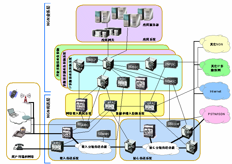 NGN網(wǎng)絡(luò)邏輯上可分為用戶網(wǎng)、接入網(wǎng)和核心網(wǎng)。網(wǎng)絡(luò)的管理界限將NGN劃分為一些不同的NGN域。接入網(wǎng)和核心網(wǎng)可在同一NGN域中,也可以屬于不同的域。域內(nèi)的網(wǎng)絡(luò)拓?fù)湫畔⒖梢詫?duì)外屏蔽。域和域之間的互通將通過網(wǎng)關(guān)來完成。NGN支持與現(xiàn)有的網(wǎng)絡(luò)互通,如電話網(wǎng)絡(luò)、蜂窩網(wǎng)絡(luò)、互聯(lián)網(wǎng)等。NGN還支持各種有"NGN意識(shí)"的用戶設(shè)備和現(xiàn)有的無"NGN意識(shí)"的終端,如模擬電話機(jī)、傳真機(jī)、ISDN終端等。這些互通都通過網(wǎng)關(guān)來完成。NGN的網(wǎng)關(guān)主要包括多媒體接入網(wǎng)關(guān)、接入媒體網(wǎng)關(guān)、中繼媒體網(wǎng)關(guān)、分組網(wǎng)關(guān)和信令網(wǎng)關(guān)。