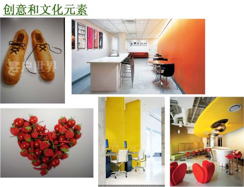 左下邊的這個(gè)圖是我自己非常喜歡的,就是在一個(gè)咖啡館里面,用一些番茄、一些小的辣椒和一些草莓搭成這樣一個(gè)形狀。上面大家看是鞋子,其實(shí)是兩塊面包把中間挖空了,鞋帶是巧克力,用這種方式來(lái)調(diào)動(dòng)別人在咖啡館里面的食欲。我們?cè)谠挿坷锩媸且粯拥模尶头,特別是那個(gè)年齡段20-25歲之間年輕的男孩子和女孩子們喜歡,甚至他們有一種重回學(xué)校的感覺(jué)都可以。所以這里面不用花太多的心思可以有很好的創(chuàng)意。在這個(gè)話房的設(shè)計(jì)當(dāng)中,覺(jué)得從環(huán)境的角度和自己能夠著手去改變的角度來(lái)看,已經(jīng)可以把你得話房做出自己的特色,就像我們?cè)谧约杭依镅b修一樣,可以有不同的色彩,也可以由不同的結(jié)構(gòu),當(dāng)然需要滿足公司給你預(yù)算的要求。