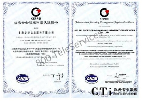 CTI論壇(ctiforum)1月31日消息(記者 浩宇):2012年1月,著名的服務(wù)外包呼叫中心和電子商務(wù)運(yùn)營(yíng)中心企業(yè)--飛翱集團(tuán)旗下全資子公司上海華泛信息服務(wù)有限公司---,繼2009年獲得ISO9001 質(zhì)量管理體系國(guó)際認(rèn)證后。經(jīng)過(guò)半年嚴(yán)格的綜合考評(píng),再次成功獲得又一由國(guó)際上公認(rèn)的ISO/IEC 27001:2005(也簡(jiǎn)稱為:ISO27001)并獲得具有美國(guó)認(rèn)證機(jī)構(gòu)國(guó)家認(rèn)可委員會(huì)ANAB授予的雙重信息安全管理體系認(rèn)證。