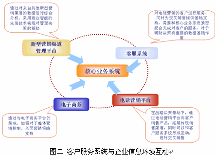 客戶服務(wù)系統(tǒng)不是孤立的系統(tǒng),是能夠與客戶現(xiàn)有信息環(huán)境,包括:核心業(yè)務(wù)系統(tǒng)、多渠道營(yíng)銷、電子商務(wù)等進(jìn)行互動(dòng)的智能信息系統(tǒng),從而使呼叫中心成為企業(yè)的戰(zhàn)略資產(chǎn),幫助企業(yè)提升客戶滿意度、深度挖掘客戶價(jià)值?蛻舴⻊(wù)系統(tǒng)與企業(yè)其它信息系統(tǒng)的互動(dòng)可以通過(guò)圖二反映。