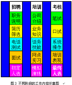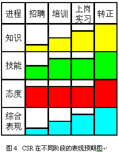 即使經(jīng)過規(guī)范的上崗培訓(xùn)與考核,新員工通常也只達(dá)到老員工70%左右的表現(xiàn)。因此制定明確的實習(xí)期,在實習(xí)期間加強指導(dǎo)和培養(yǎng)是非常重要的。通常經(jīng)過3個月的實習(xí),新員工已經(jīng)可以達(dá)到一個標(biāo)準(zhǔn),這時便可以轉(zhuǎn)正了。圖3和圖4表現(xiàn)了不同階段對CSR的不同預(yù)期,以及不同階段的主要工作。