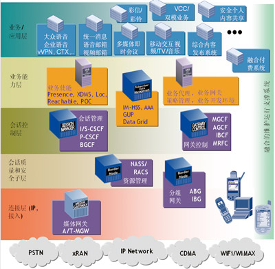 。。阿爾卡特朗訊會(huì)話管理實(shí)現(xiàn)IMS的P-CSCF、I/S-CSCF和BGCF的功能,網(wǎng)關(guān)控制包括MGCF和IBCF。會(huì)話管理支持2G/3G的GGSN、CAMD的PDSN、WLAN的PDG、固定有/無線的ABG的接入和會(huì)話處理。