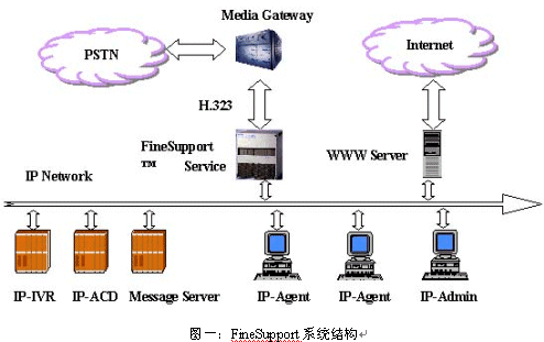 Finesupport是一個(gè)完全基于IP網(wǎng)絡(luò)的呼叫中心,不同于智能網(wǎng)應(yīng)用或CTI應(yīng)用。其應(yīng)用建立在Soft Switch體系之上,媒體流總是在第一時(shí)間被報(bào)文化,成為數(shù)據(jù)流,此后整個(gè)應(yīng)用系統(tǒng)中處理的完全是數(shù)據(jù),主要通過軟件來實(shí)現(xiàn),因而在降低成本、開展新業(yè)務(wù)、平滑升級方面具有極大的優(yōu)勢。
