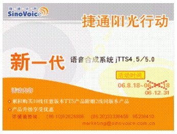 2006年8月18日,捷通華聲正式發(fā)布新一代語音合成系統(tǒng)jTTS4.5,同時啟動了為期三個月的“陽光行動”。行動一經(jīng)推出,立即引起了強烈的市場反響。每日致電(86-10)82826886咨詢jTTS4.5產(chǎn)品及價格詳情的客戶接連不斷,通過訪問捷通華聲語音合成在線演示系統(tǒng)http://www.sinovoice.com.cn/2-e-1.asp或者撥打24小時產(chǎn)品演示熱線(86-10)82826886-8624體驗合成效果自然度和流暢度的用戶絡(luò)繹不絕,定購產(chǎn)品享受累積購買10線任意版本TTS附贈2線同版本產(chǎn)品等優(yōu)惠政策的合作伙伴更是紛至沓來。大家都對jTTS4.5的新增甜美音色大加贊賞,更對jTTS4.5合成效果自然度和流暢度的提升給予了極大的肯定及滿意,同時表達出希望能延長活動時間的誠懇建議。為答謝新老客戶對捷通產(chǎn)品的關(guān)注與厚愛,捷通公司特決定將“陽光行動”活動時間延期至12月31日。