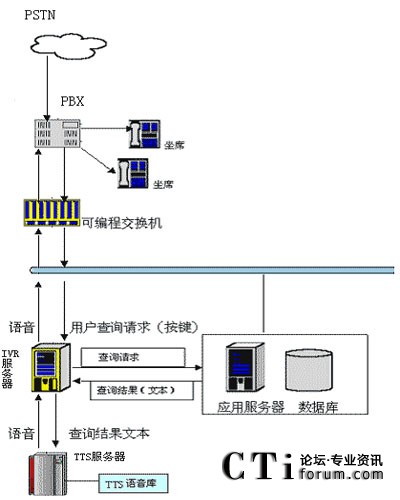 用戶可以通過電話提交他的查詢請求(比如使用按鍵方式,提交個人卡號等),IVR服務(wù)器收到請求后會向其他應(yīng)用服務(wù)器提交此查詢請求,當(dāng)IVR得到查詢結(jié)果后,他會將文本形式的查詢結(jié)果交給jTTS服務(wù)器,jTTS服務(wù)器會返回查詢結(jié)果的語音形式,最終語音會在坐席上播放,用戶就可以聽到他剛才所要查詢的信息。