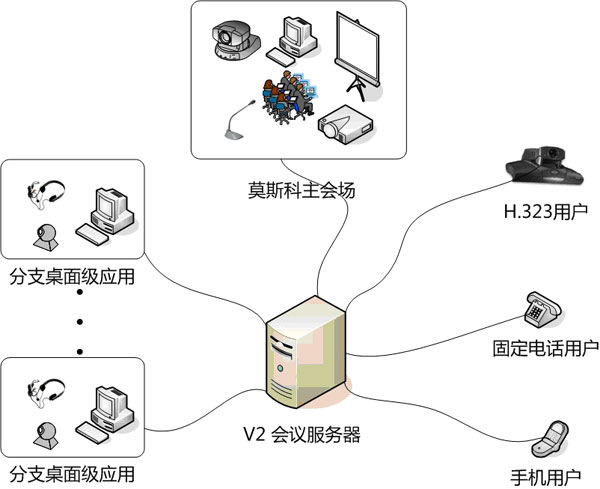 俄羅斯百事可樂(lè)公司莫斯科總部和俄羅斯其它各地分支機(jī)構(gòu)通過(guò)公眾互聯(lián)網(wǎng)連接,以V2視頻會(huì)議系統(tǒng)為紐帶,將不同的參會(huì)用戶連接在一起,實(shí)現(xiàn)即時(shí)的音視頻溝通及數(shù)據(jù)協(xié)作。不僅是普通的PC機(jī)用戶,包括傳統(tǒng)H.323用戶,手機(jī)和固定電話用戶等都可以加入V2視頻會(huì)議。