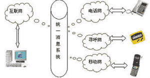 UMS可以將電子郵件、語音、尋呼、移動短消息、傳真和多媒體數(shù)據(jù)等所有信息類型集合為一個信息,并可用電話、傳真、手機、呼機、PC、掌上電腦、PDA等通信設備中的任何一種接收,在有線、無線、互聯(lián)網(wǎng)之間架構(gòu)起一個信息互聯(lián)通道(如圖)。統(tǒng)一信息系統(tǒng)(Unified