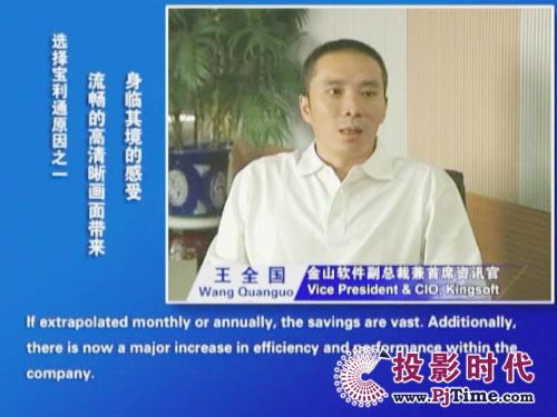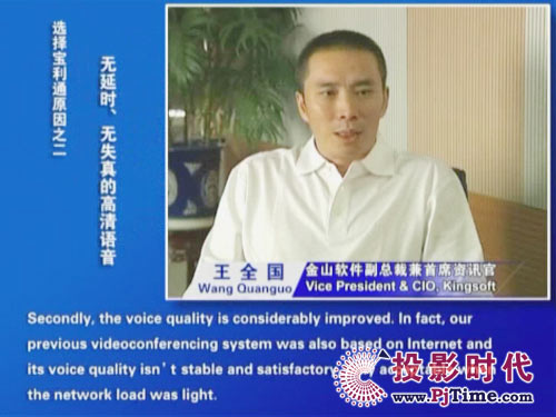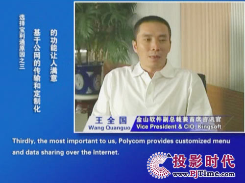 金山軟件副總裁兼首席資訊官王全國先生說道:“對(duì)于軟件行業(yè)來說,及時(shí)、高效的溝通是保持競爭優(yōu)勢(shì)的重要前提。相比之前使用的標(biāo)清產(chǎn)品,寶利通高清視頻會(huì)議系統(tǒng),提供了完全不同的體驗(yàn),流暢的高清晰畫面猶如真實(shí)的面對(duì)面溝通。而且我們公司并沒有申請(qǐng)專線,所有的應(yīng)用都是基于公網(wǎng)實(shí)現(xiàn)的。另一方面,新型全中文定制菜單的運(yùn)用,令我們使用起來非常方便,這更提高了我們使用視頻通信手段實(shí)現(xiàn)異地溝通的熱情。”