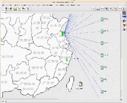 ●網(wǎng)絡(luò)結(jié)構(gòu)和網(wǎng)絡(luò)狀態(tài)總覽:按照網(wǎng)元地理位置提供直觀的網(wǎng)絡(luò)視圖,并通過顏色的變化和圖標(biāo)的閃爍表示網(wǎng)元的運(yùn)行狀態(tài)和鏈路的負(fù)荷狀況;