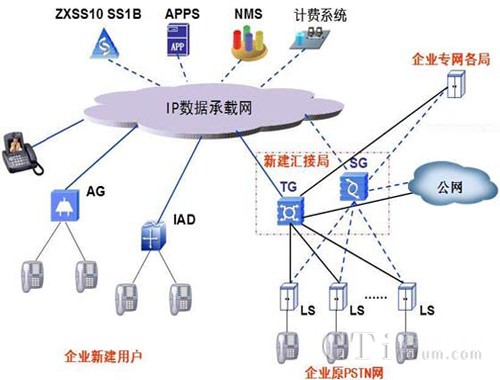以大企業(yè)寬帶數(shù)據(jù)局域網(wǎng)為基礎傳送平臺,通過在該網(wǎng)絡部署軟交換網(wǎng)絡系統(tǒng)及業(yè)務平臺系列設備,將數(shù)據(jù)、語音和視頻集中在一個統(tǒng)一的IP網(wǎng)絡之上,滿足現(xiàn)代化企業(yè)的多媒體綜合通信需求。