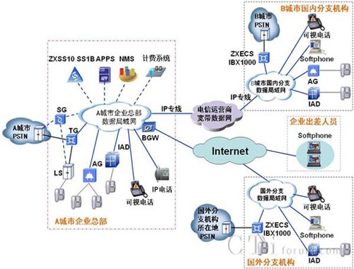 該方案以IBX1000為核心設備,可以直接下掛IP電話、視頻電話,或者直接在PC電腦上安裝Softphone,也可以通過IAD下接普通模擬電話、傳真,組網(wǎng)靈活便捷,根據(jù)客戶需求靈活選擇。在IBX1000設備的控制下,直接通過企業(yè)數(shù)據(jù)網(wǎng)的傳送實現(xiàn)企業(yè)內(nèi)部語音、視頻和數(shù)據(jù)等多媒體綜合通信業(yè)務,大幅度降低辦公室之間溝通上通信成本,分支機構(gòu)與總部的語音仍然通過運營商的PSTN長途網(wǎng)來解決。