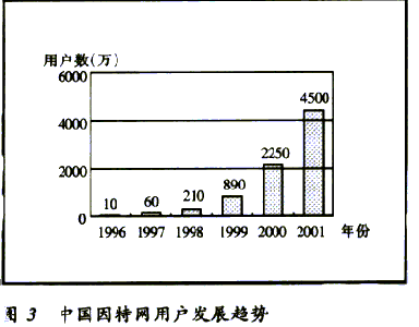 據(jù)CNNIC統(tǒng)計(jì)的數(shù)據(jù)表明,到2000年12月31日止,中國的因特網(wǎng)用戶達(dá)到2250萬戶,上網(wǎng)計(jì)算機(jī)892萬臺,預(yù)計(jì)2001年中國將有超過4500萬的網(wǎng)民。中國域名總數(shù)為12.2萬個(gè),WWW站點(diǎn)數(shù)26.54萬個(gè)。中國因特網(wǎng)的發(fā)展速度驚人,與國際因特網(wǎng)的發(fā)展速度相當(dāng)。中國因特網(wǎng)用戶發(fā)展趨勢見圖3。