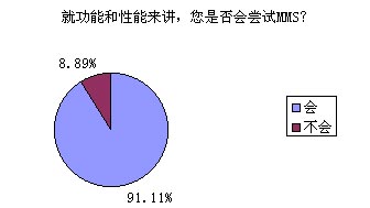 題8的調(diào)查結(jié)果對于中國移動來講絕對是充滿誘惑的,高達(dá)91.11%的被訪者表示他們非常愿意嘗試MMS的功能和服務(wù),無疑這對ICP們(MMS服務(wù)的重要載體)也是一針強心劑啊!