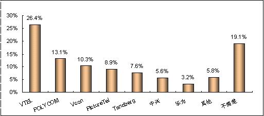 各品牌的認(rèn)知度與其市場銷售情況息息相關(guān)。例如,VTEL是最早進(jìn)入中國市場的視頻會議廠商,并在相當(dāng)長的時期內(nèi)占據(jù)市場領(lǐng)先地位,取得顯著的品牌認(rèn)知度是有其廣泛用戶基礎(chǔ)作為支撐的;POLYCOM雖然從1998年才開始進(jìn)軍中國市場,但在基于IP的視頻會議系統(tǒng)的市場爭奪中取得較好的成績;PictureTel已經(jīng)被POLYCOM收購,品牌認(rèn)知度也相對較低;而國內(nèi)品牌中興、華為剛剛起步,也很難達(dá)到較高的認(rèn)知度。