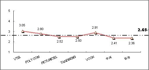 為深入了解和對比被調(diào)查者對不同品牌視頻會議終端系統(tǒng)產(chǎn)品的認(rèn)知程度,本次調(diào)查將被調(diào)查者對各主要品牌的了解程度劃分為五個檔次,對不同的檔次賦予不同的分值,分別為“非常了解(5分)”、“了解(4分)”、“一般(3分)”、“不了解(2分)”、 “非常不了解(0分)”,同時綜合考慮以購買用戶擁有的品牌分布,借以比較不同品牌在認(rèn)知度上的差異。統(tǒng)計結(jié)果顯示,目前在中國市場上,用戶對主要視頻會議終端系統(tǒng)產(chǎn)品品牌的了解程度的平均值為2.65,各品牌認(rèn)知度分值見圖6。其中:VTEL品牌的知名度最高,指標(biāo)值為3.05,超過了“一般”了解水平;其次為VCON品牌,指標(biāo)值為2.91;POLYCOM的知名度指標(biāo)值為2.8,處于第三位。除VTEL品牌外,其他主要品牌的知名度還都處于低于“一般”了解水平階段,反映出產(chǎn)品的市場認(rèn)知還較低。