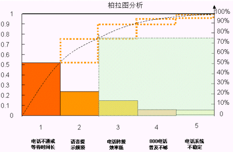 通過(guò)匯總的數(shù)據(jù)進(jìn)行分析,他們發(fā)現(xiàn)客戶不滿意的原因很多,于是選取了最大的五個(gè)原因, 用"柏拉圖"做了分析,同時(shí),對(duì)于這最重要的五個(gè)原因又作了一次頭腦風(fēng)暴和"魚骨圖分析"。