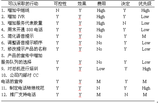 項(xiàng)目小組接下來(lái)對(duì)列舉的眾多原因合并、歸類并再次進(jìn)行頭腦風(fēng)暴,并"可控性"、"實(shí)施預(yù)期效果"、"實(shí)施費(fèi)用"、"是否可以由項(xiàng)目小組作決定"、"優(yōu)先級(jí)"等幾個(gè)方面對(duì)可以采取的行動(dòng)進(jìn)行逐項(xiàng)分析(見下圖),最終確定1、5、9、10、11、12項(xiàng)納入到實(shí)施方案,指定相應(yīng)的實(shí)施負(fù)責(zé)人,制定相應(yīng)實(shí)施時(shí)間表,實(shí)施時(shí)長(zhǎng)為三個(gè)月。