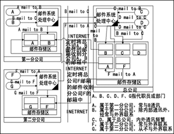 · F mail to A:F發(fā)郵件給A,此郵件經(jīng)由Internet發(fā)到總公司A的信箱中,因?yàn)橛蛎潜唤忉尩娇偣镜姆⻊?wù)器上,第一分公司的服務(wù)器會定時將總公司A信箱中的郵件取回,所以對A來講,F(xiàn)發(fā)來的郵件就好像是直接遞送到本公司的服務(wù)器上一樣。