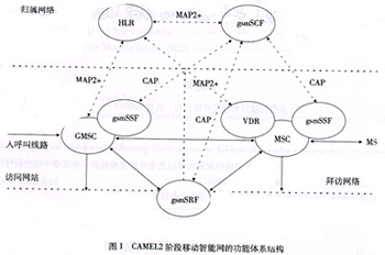 在移動通信領域,歐洲電信標準學會(ETSI)制定的CAMEL系列標準為基于GSM移動通信網絡的移動智能網提供了統(tǒng)一的規(guī)范。其中CAMEL2階段的標準符合ITU-T的IN CS-1,支持各種基于語音的智能業(yè)務。CAMEL2階段移動智能網的功能體系結構如圖1所示。CAMEL3階段的標準基于CS-2,主要增加了對GPRS移動數據業(yè)務以及短消息業(yè)務的支持。