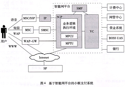 鑒于以上原因,目前中國移動正在建設的全國范圍的小額支付系統(tǒng)已確定采用基于智能網平臺的建設方式;谥悄芫W平臺的小額支付系統(tǒng)如圖4所示。