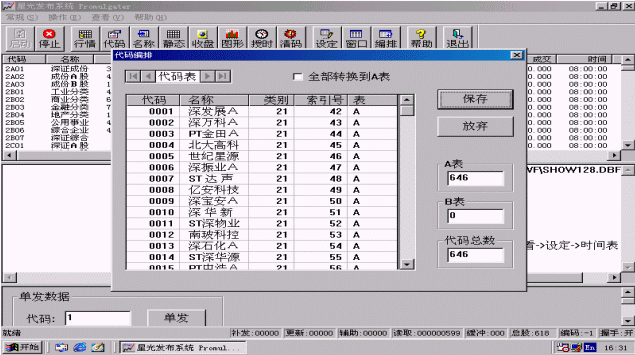 注意:股票機(jī)器要求必須把記錄的索引放在A表或者B表。A表或B表中如果有任何一項(xiàng)數(shù)據(jù)改動(dòng)過(guò)(添加、刪除或修改),整個(gè)A表或B表的代碼都需重新發(fā)送。因此,我們建議把股票代碼分開(kāi)存放在A、B兩個(gè)表,A表存放不改變的代碼,大部分已發(fā)行的代碼可以認(rèn)為是不會(huì)改變了。一旦有新代碼出現(xiàn),我們把它存放在B表中,這樣,只需重發(fā)B表就可以了,而A表中的代碼因?yàn)闆](méi)有改變,因此就不必重新發(fā)送了,從而大大的節(jié)約了發(fā)送時(shí)間。如果有新股上市,它就會(huì)自動(dòng)添加到B表。
