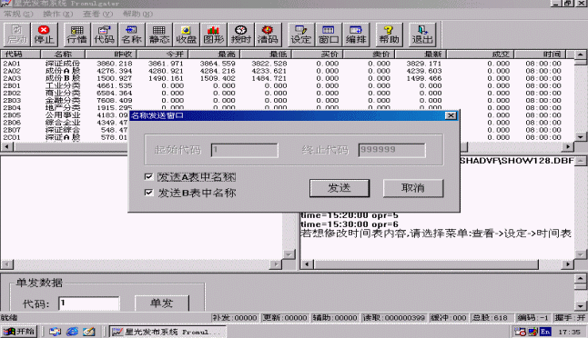 名稱(chēng)可以只發(fā)A表或者B表,也可以單發(fā)一條或提示輸入一段代碼范圍來(lái)發(fā)送,否則,將發(fā)送所有的證券名稱(chēng)。