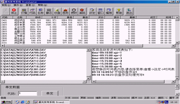 中匯金融信息臺(tái)股票信息發(fā)布系統(tǒng)是中匯金融信息臺(tái)同星傳通信科技(深圳)有限公司共同開(kāi)發(fā)研制的新一代高速股票信息發(fā)布系統(tǒng),它配合中匯金融信息臺(tái)現(xiàn)行使用的星光產(chǎn)SP658、SP659、SP688高速股票機(jī),實(shí)現(xiàn)深、滬兩市證券交易行情的實(shí)時(shí)發(fā)布,刷新速度最快可達(dá)20秒/遍,是目前全國(guó)刷新速度最快的尋呼股票發(fā)布系統(tǒng)之一。該系統(tǒng)兼顧多種信息源輸入格式,配置靈活,采用最為普及和成熟的POCSAG尋呼編碼技術(shù),最大限度地為用戶(hù)節(jié)約運(yùn)營(yíng)成本。該發(fā)布系統(tǒng)集信息源接收和信息發(fā)布于一臺(tái)PC機(jī)中,一邊接收?qǐng)D文電視的股票數(shù)據(jù),一邊整理發(fā)送到編碼器,不但節(jié)約了電腦設(shè)備,而且避免了信息上網(wǎng)交換帶來(lái)的延遲,不愧為一種經(jīng)濟(jì)快捷的發(fā)送方式。