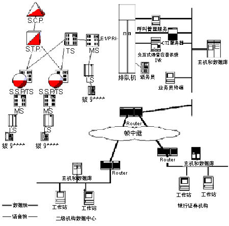 該公司全國客戶呼叫中心的建設包括兩大部分,一部分是在上海設立服務于全國的電話呼叫中心,為客戶提供全國統(tǒng)一的服務;另一部分是在全國建立該公司專用數據網絡系統(tǒng),該公司分支機構與總部之間通過專用數據傳輸網絡,進行數據傳輸。經研究分析,建議在該公司全國呼叫中心服務系統(tǒng)的方案中,對于語音的傳遞,該公司將采用中國電信為其提供的PSTN網接入全國呼叫中心,客戶只需撥打信息產業(yè)部為該公司核配的短號碼9****,利用中國電信的智能網系統(tǒng)即可及時有效地接入到該公司上海的電話呼叫中心,得到優(yōu)質高效的語音服務。系統(tǒng)如下圖所示: