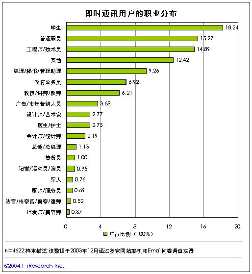 從即時通訊用戶的職業(yè)結(jié)構(gòu)來看,在中國的即時通訊用戶中,學生、普通公司職員、工程技術(shù)人員構(gòu)成了最主要的用戶群體,其中學生的比例最高,達到了18.24%?撮_學生是中國即時通訊的生力軍。