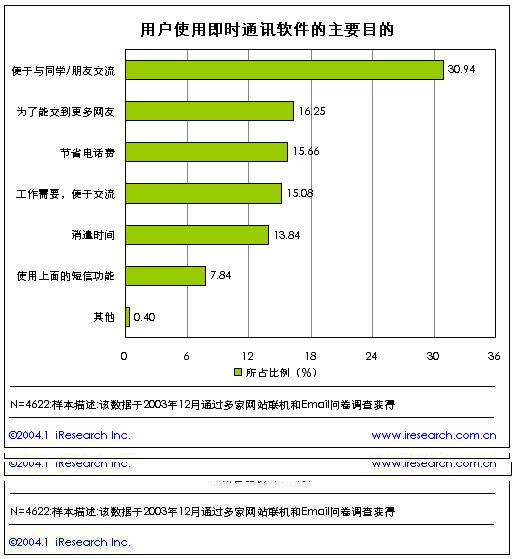 即時通訊作為網(wǎng)民最常使用的應(yīng)用之一,即時通訊的多功能性可以滿足用戶的不同需求,達到不同的目的,根據(jù)艾瑞市場咨詢(iResearch)的研究結(jié)果,在問及用戶使用即時通訊的目的時,有31%的用戶選擇了“便于與同學/朋友交流”作為使用即時通訊軟件的最主要的目的,16%的用戶選擇“為了交到更多的朋友”作為作主要的目的,兩者相加的比例接近了50%。說明與朋友、網(wǎng)友間的交流聊天仍然是即時通訊軟件的最主要的功能。同時,即時通訊軟件用戶一般還同時使用包括文件傳送、語音聊天、郵件檢查、群組聊天、手機綁定等其他功能。而文件傳輸是其中最主要的一項功能。