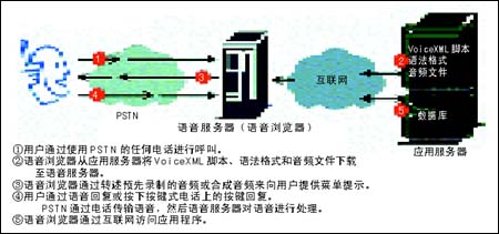 由于電話(包括很多蜂窩電話)沒有計算功能,無法管理語音瀏覽器,所以語音瀏覽器駐留在網(wǎng)絡(luò)上的語音服務(wù)器中。語音服務(wù)器可以位于企業(yè)數(shù)據(jù)中心,或者位于主管供應(yīng)商處。用戶撥叫一臺語音服務(wù)器,該服務(wù)器從一臺應(yīng)用服務(wù)器上下載VoiceXML 2.0腳本、語法格式和聲音文件。語音瀏覽器以一種語音信息的形式將VoiceXML 2.0腳本翻譯給用戶聽,語音信息可以是預先錄制的語音,或經(jīng)由一個文本語音合成器產(chǎn)生的文本。然后語音瀏覽器調(diào)用一個自動語音識別(ASR)軟件,使用語法格式來識別出用戶響應(yīng)的語音詞匯。